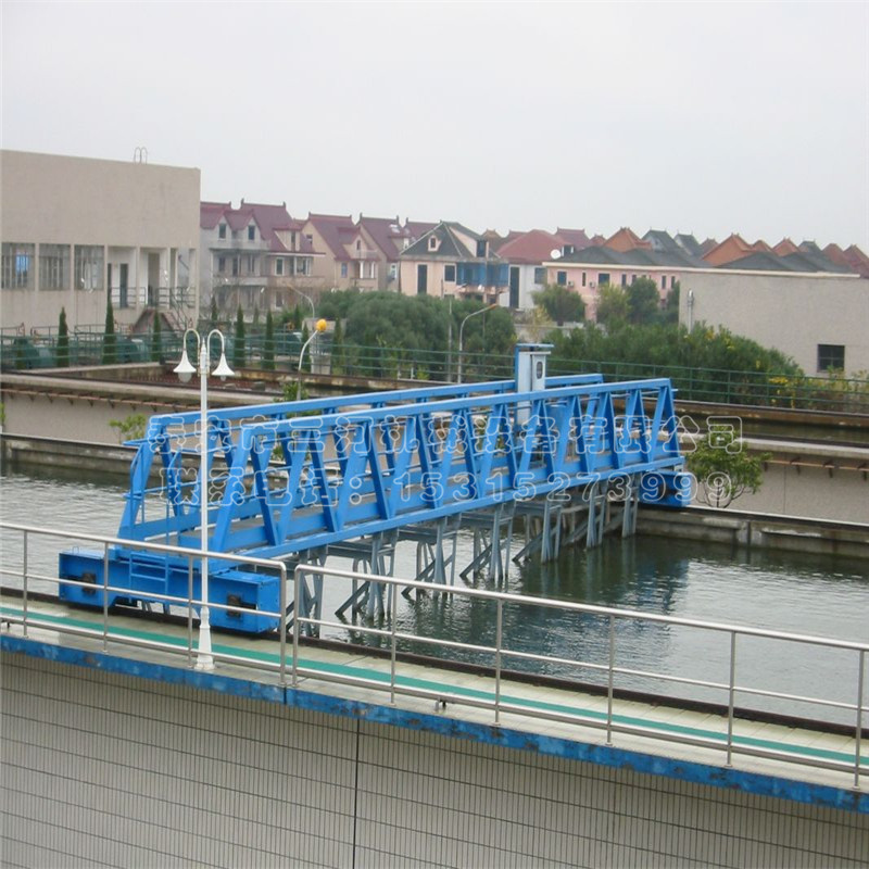 行车式刮泥机适用于给排水工程中平流式沉淀池,将沉降在池底的污泥刮集至集泥槽,并将池面的浮渣撇向集渣槽。可根据用户的要求设置浮渣刮板。按水流方向,可分为逆向刮泥逆向排渣和逆向刮泥同向排渣方式。刮泥机构在不刮泥回程时刮泥耙全部抬起。当回到刮泥的起始位置时,刮泥耙落下,这样周而复始的工作。